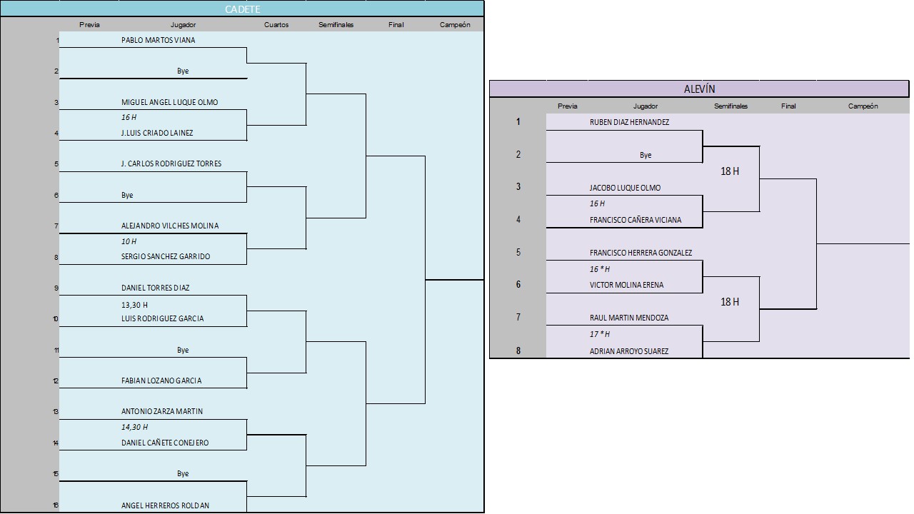 masculinas. 17-04-2009 Ya están publicados los 4 cuadros se han formado para este torneo, así como los horarios de juego. Los partidos comenzarán en Las Fuentezuelas a partir de las 16h de hoy viernes y los horarios se intentarán ir actualizando cuanto antes por esta página adecuándonos a la posible lluvia.